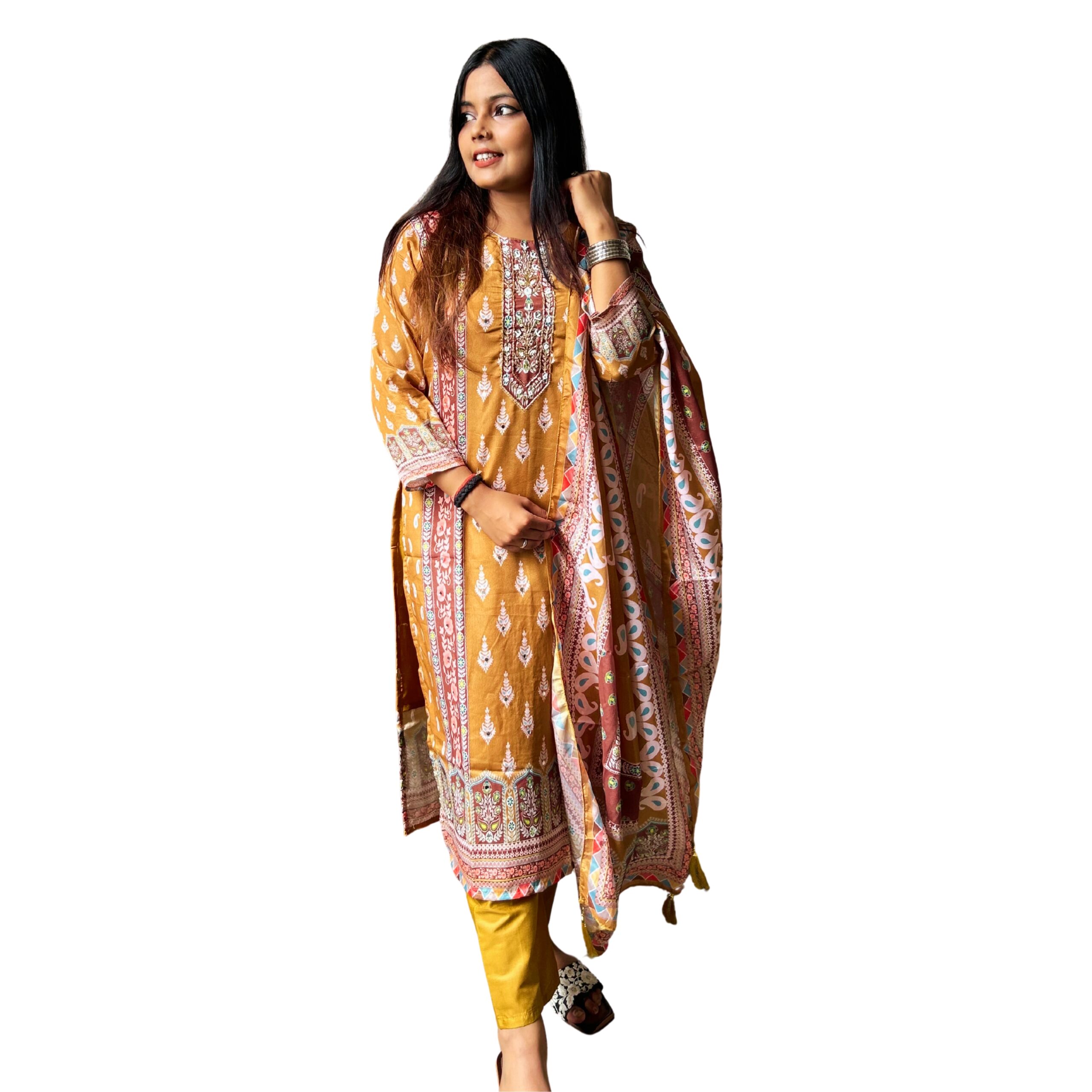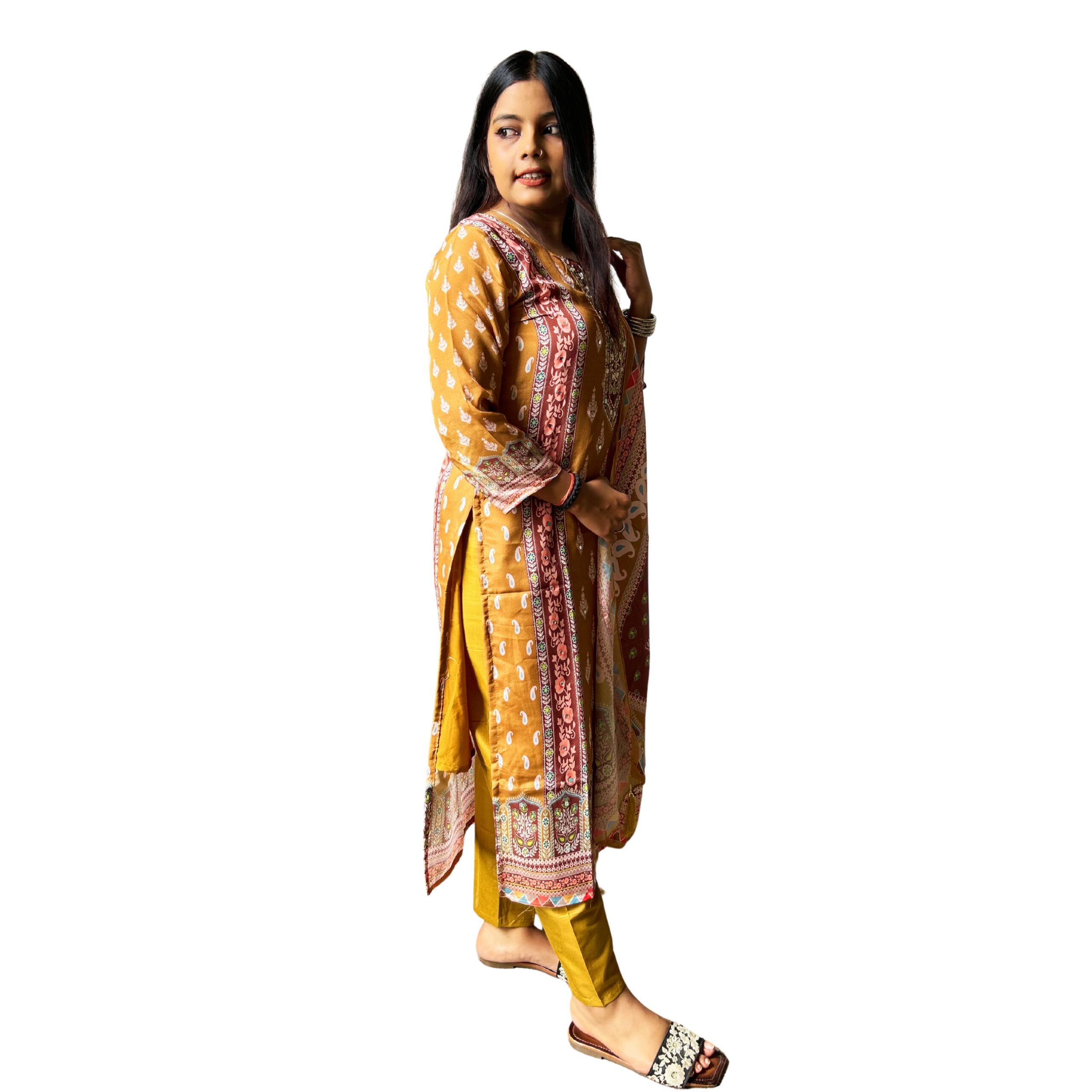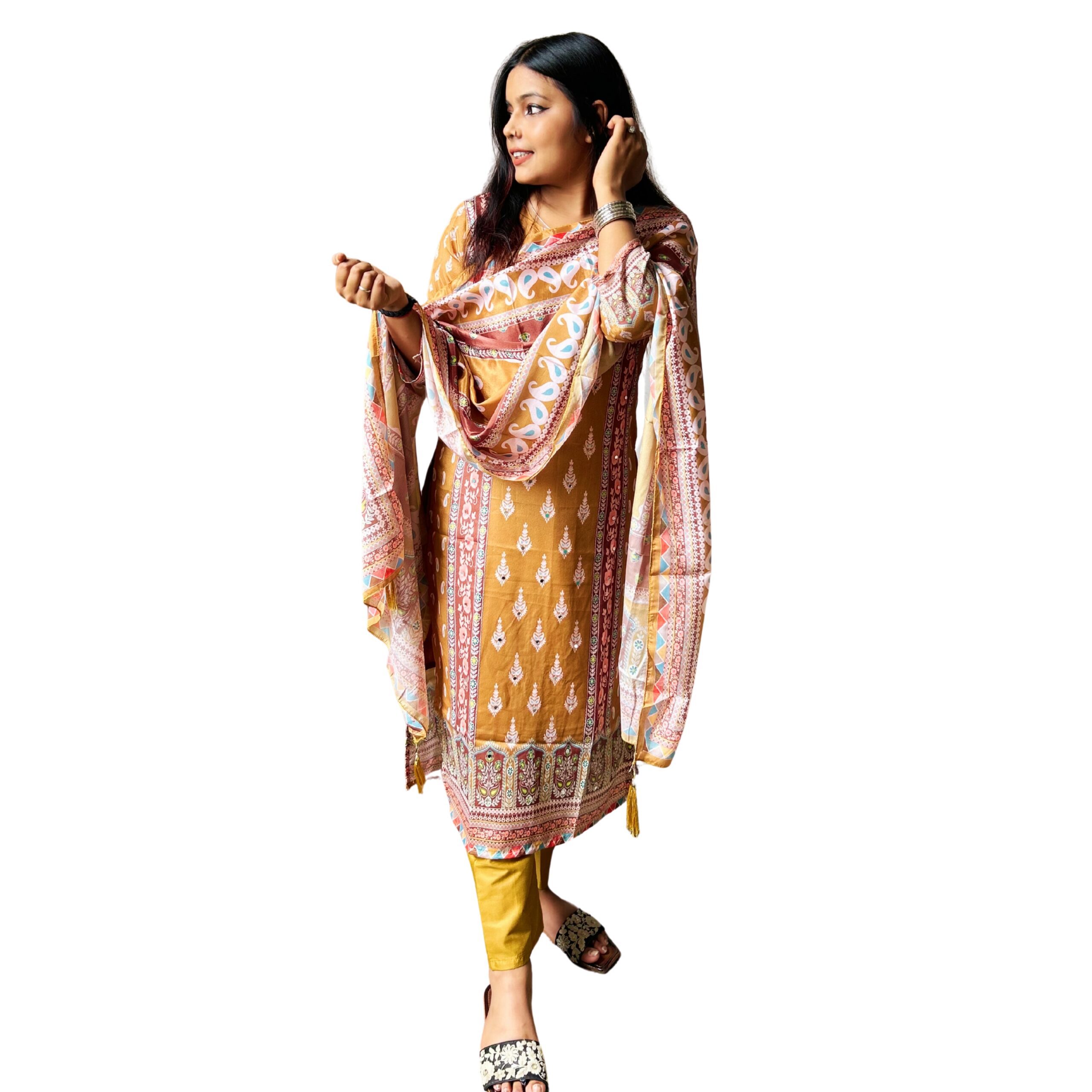 & Free ShippingWomen’s Mustard Yellow Printed Cotton Kurta with Embroidered Neckline, Matching Pants & Dupatta – Ethnic Wear Set.