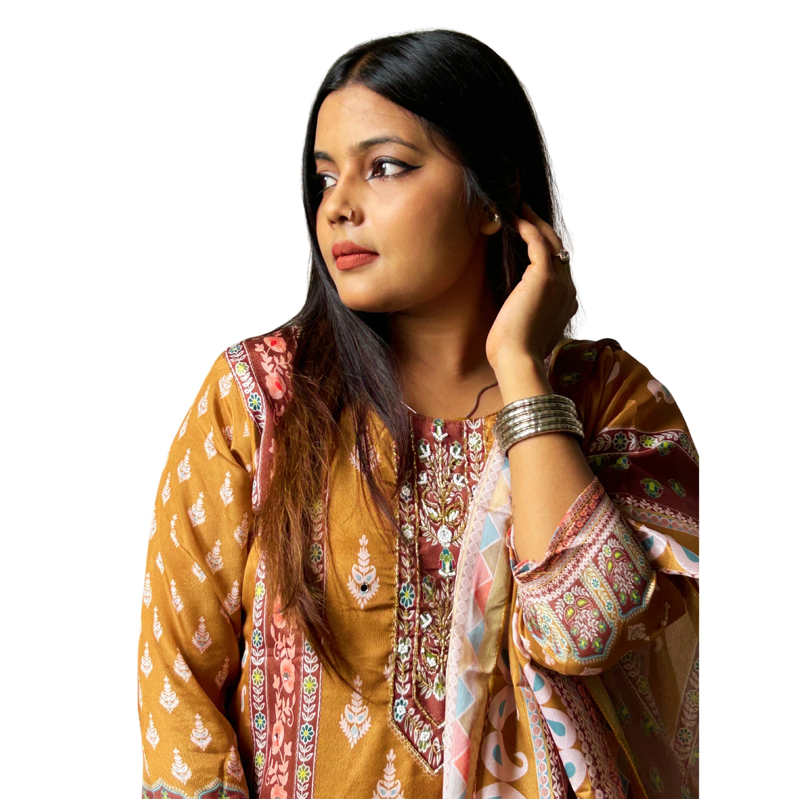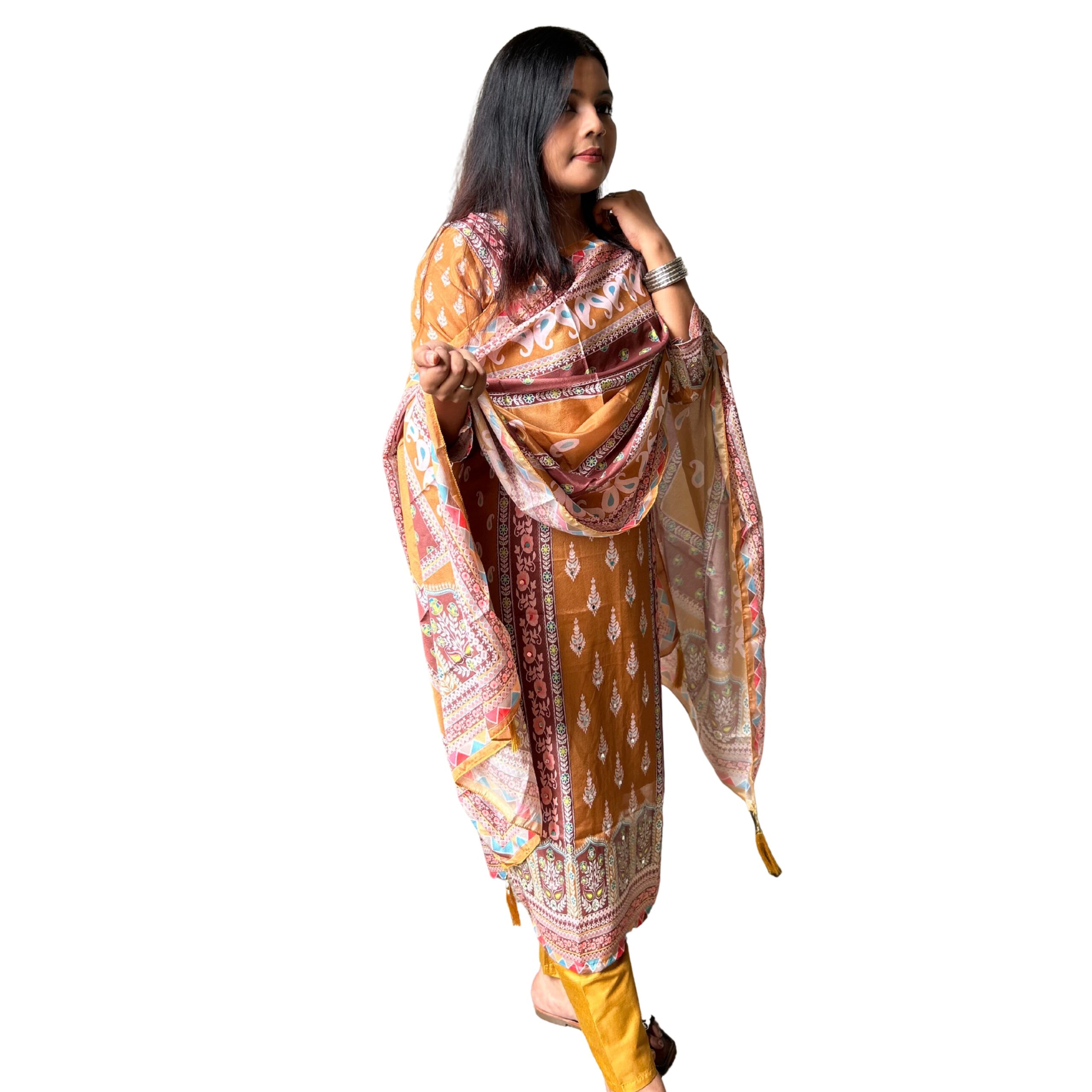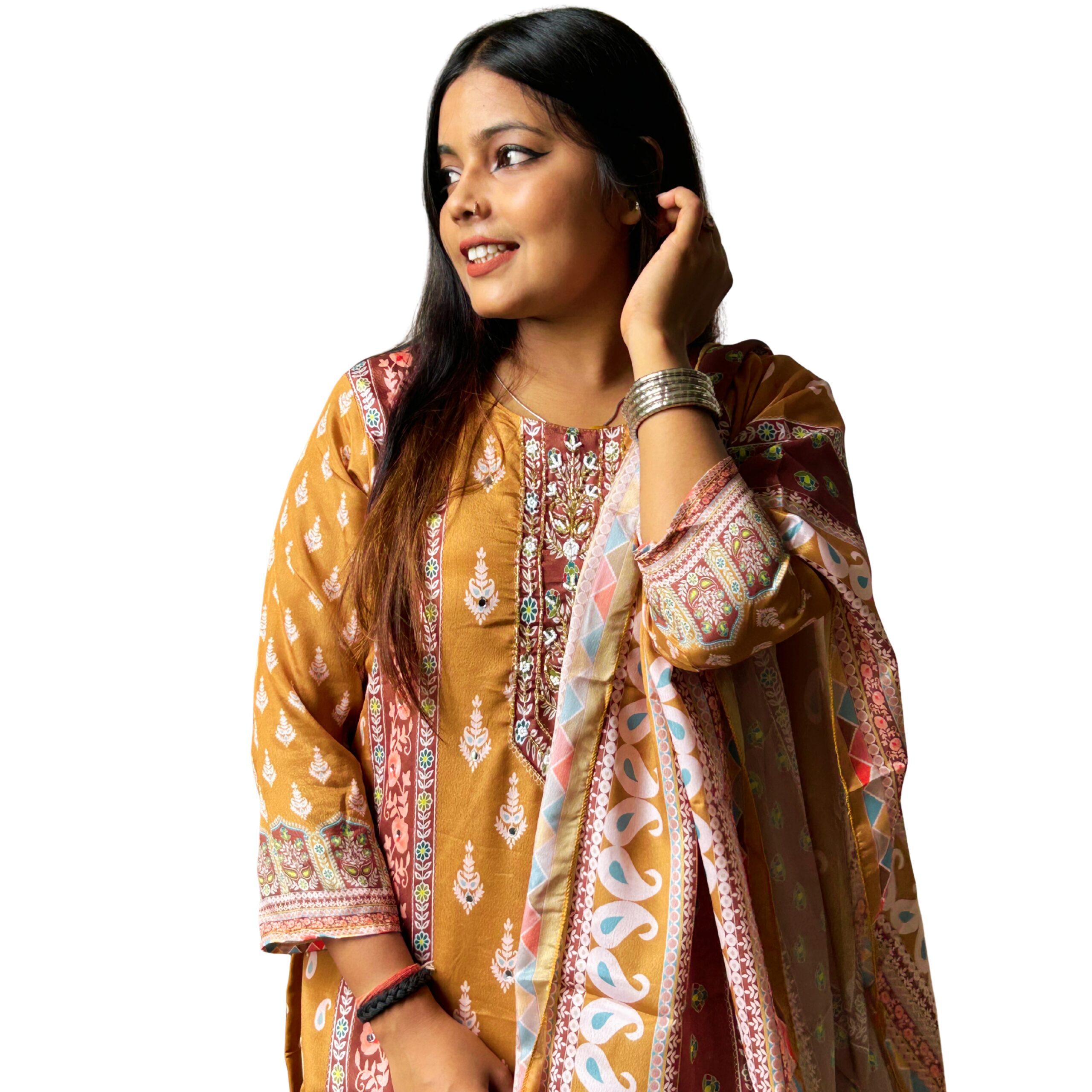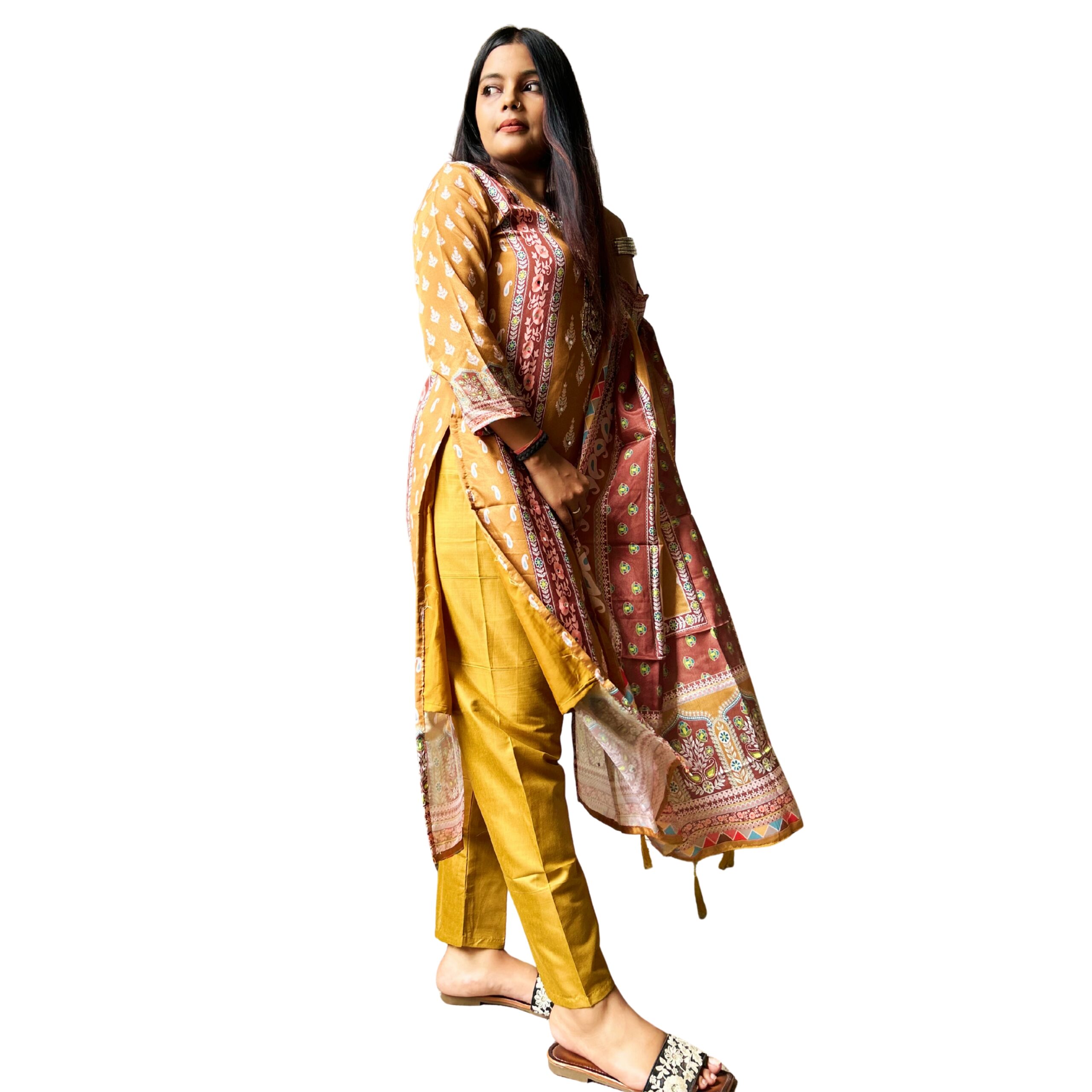 & Free ShippingWomen’s Mustard Yellow Printed Cotton Kurta with Embroidered Neckline, Matching Pants & Dupatta – Ethnic Wear Set.