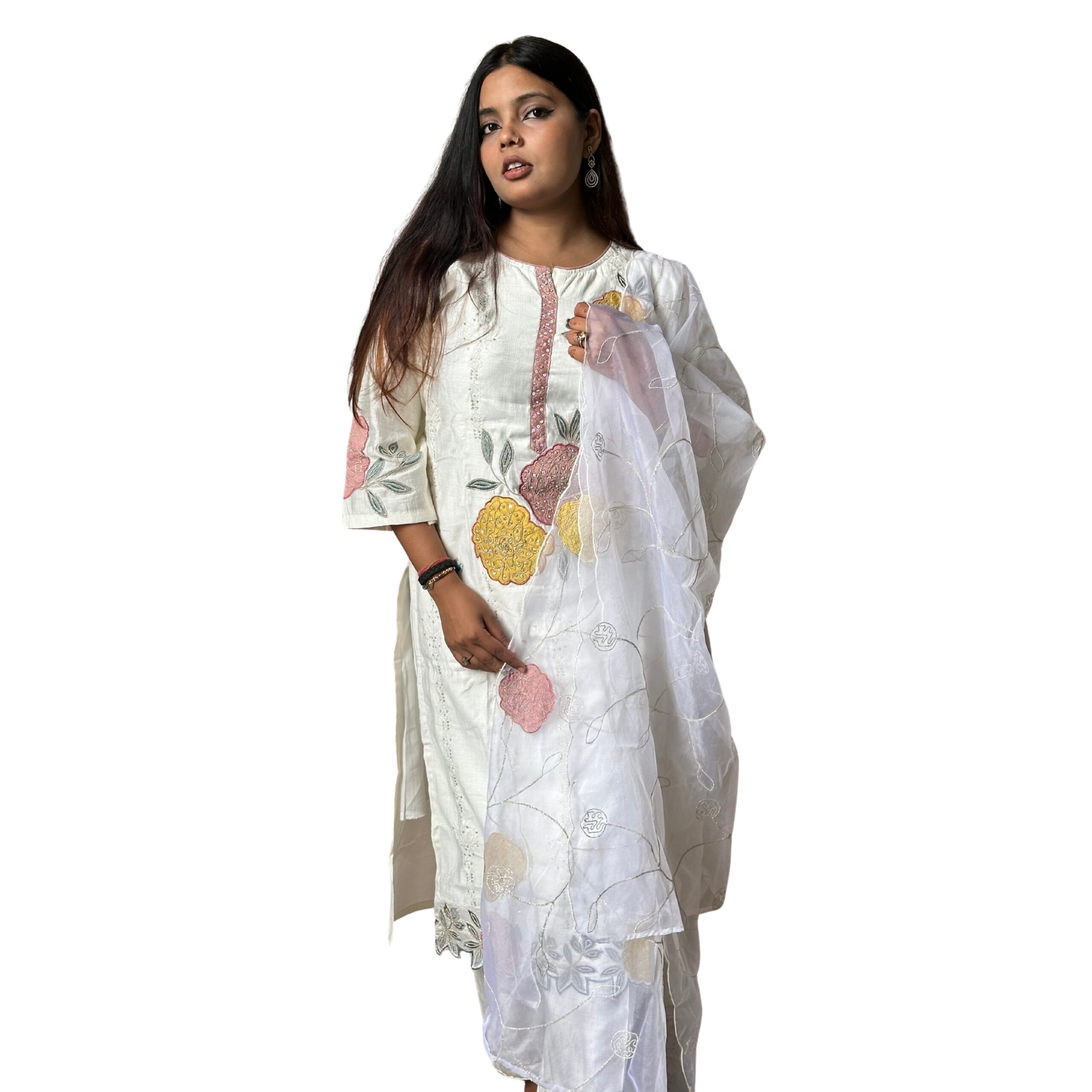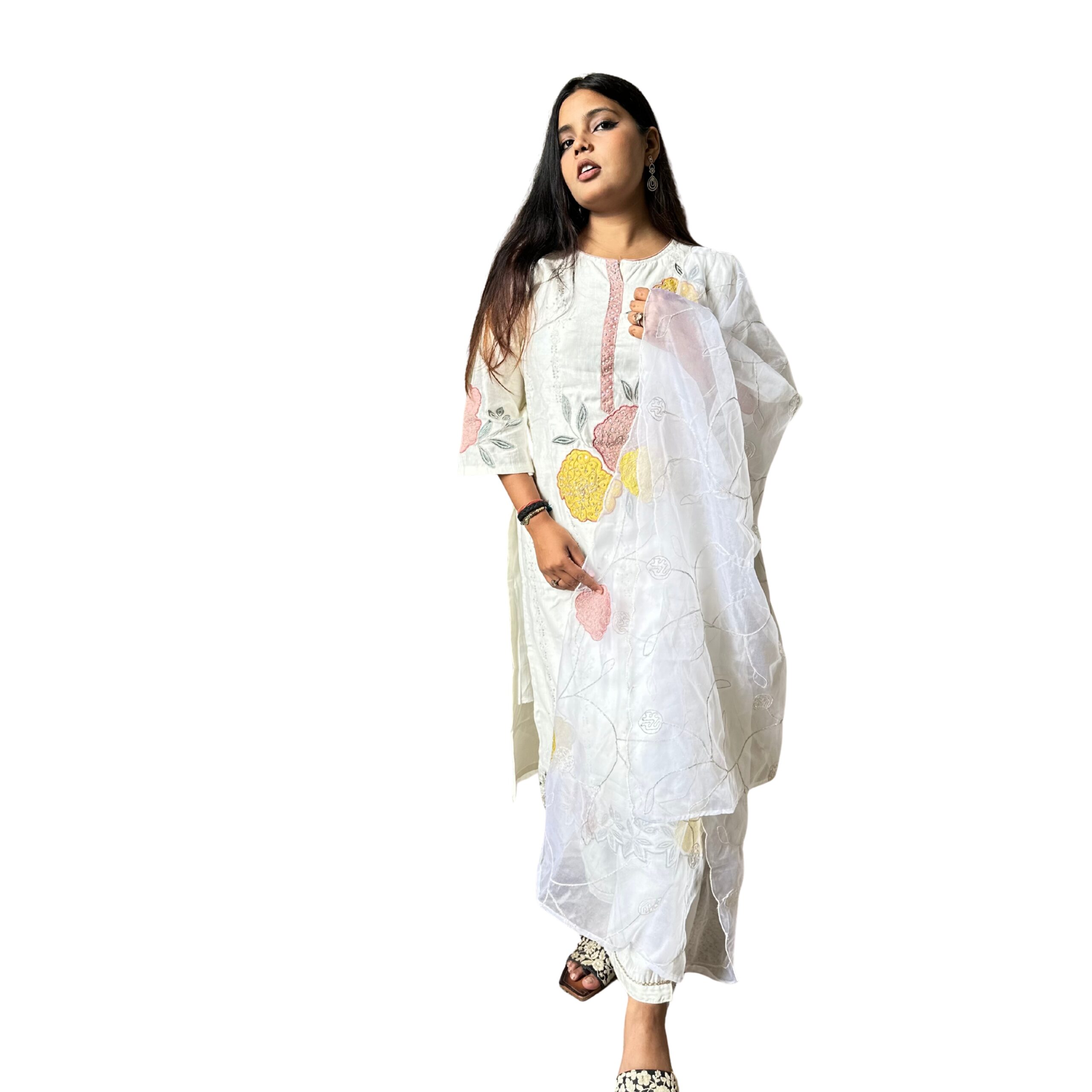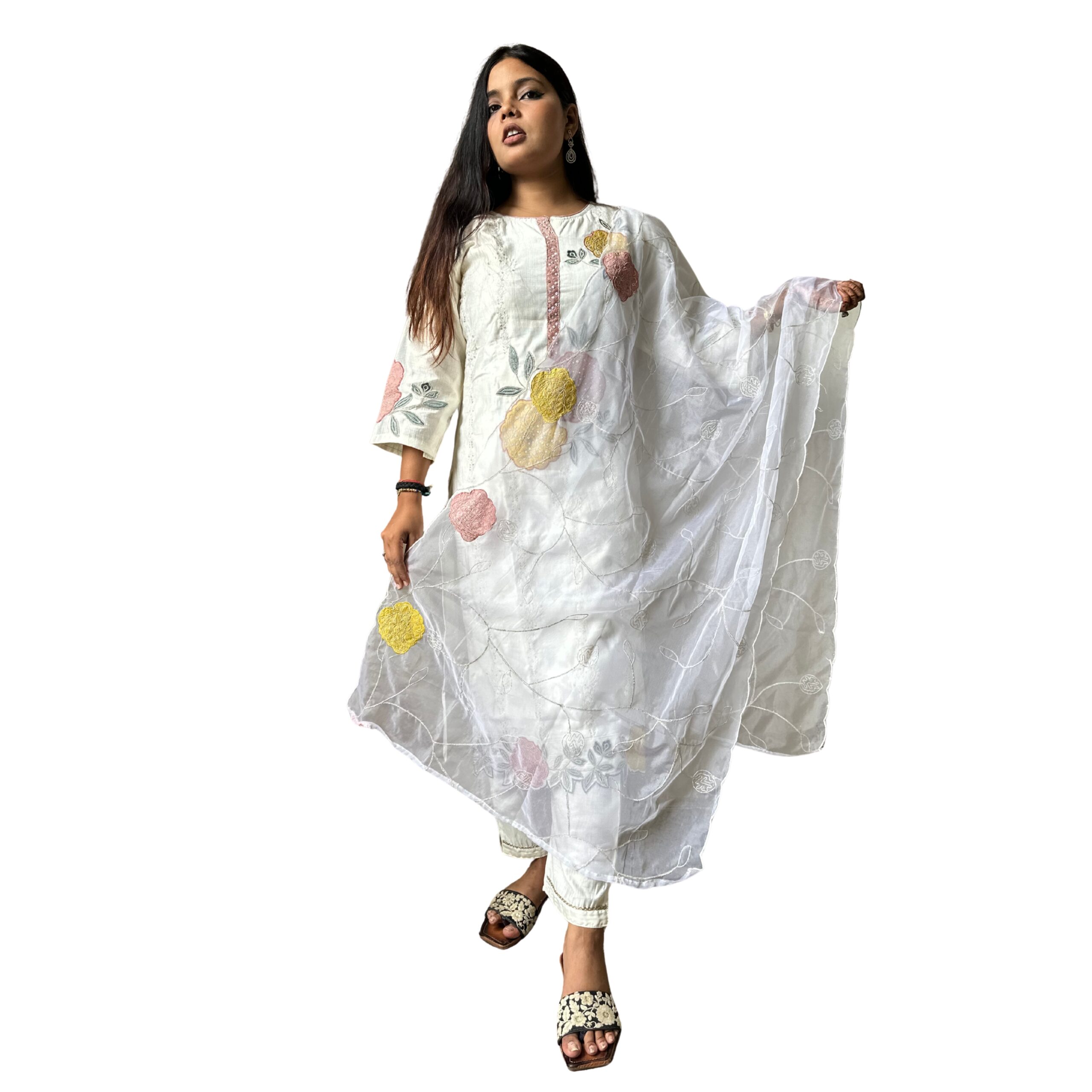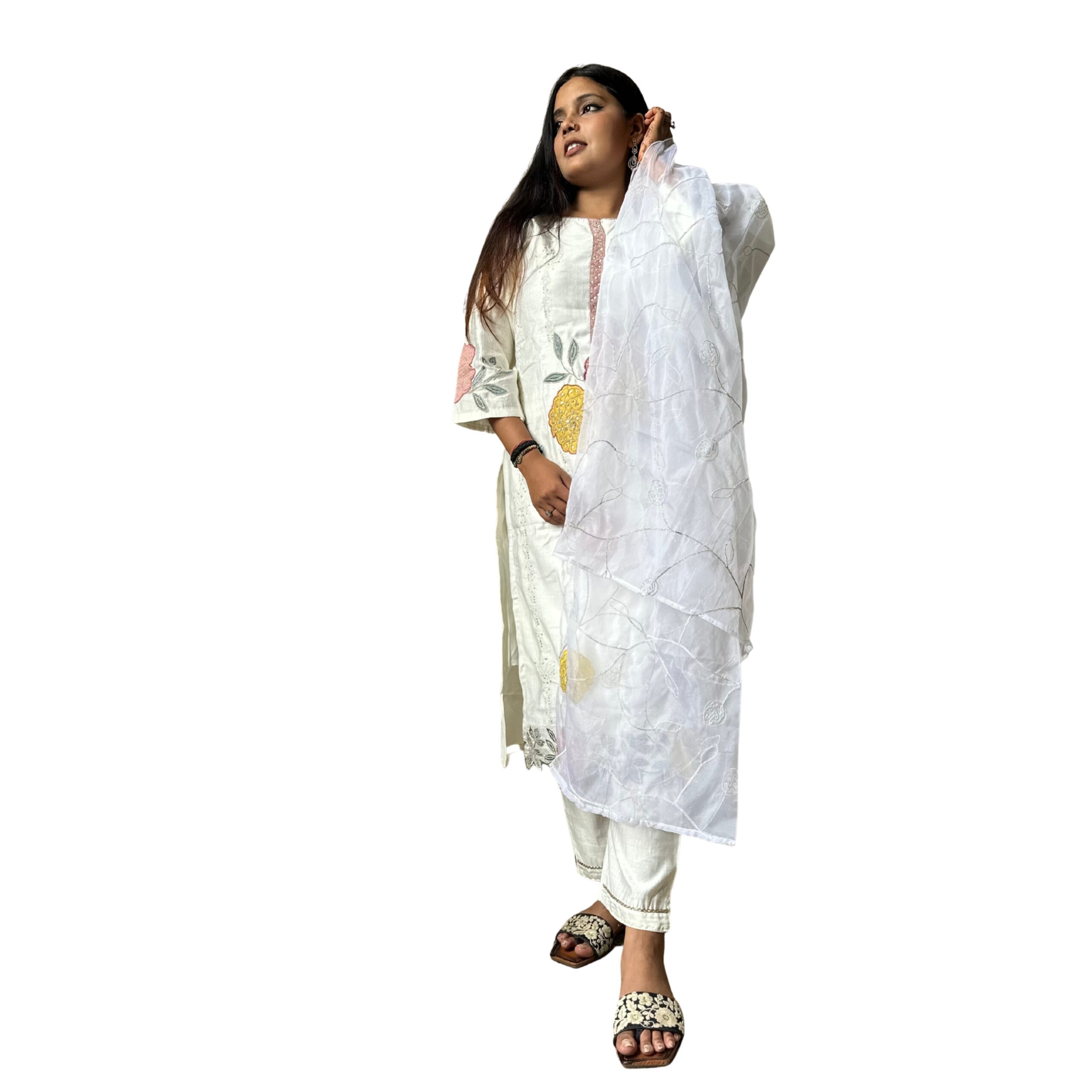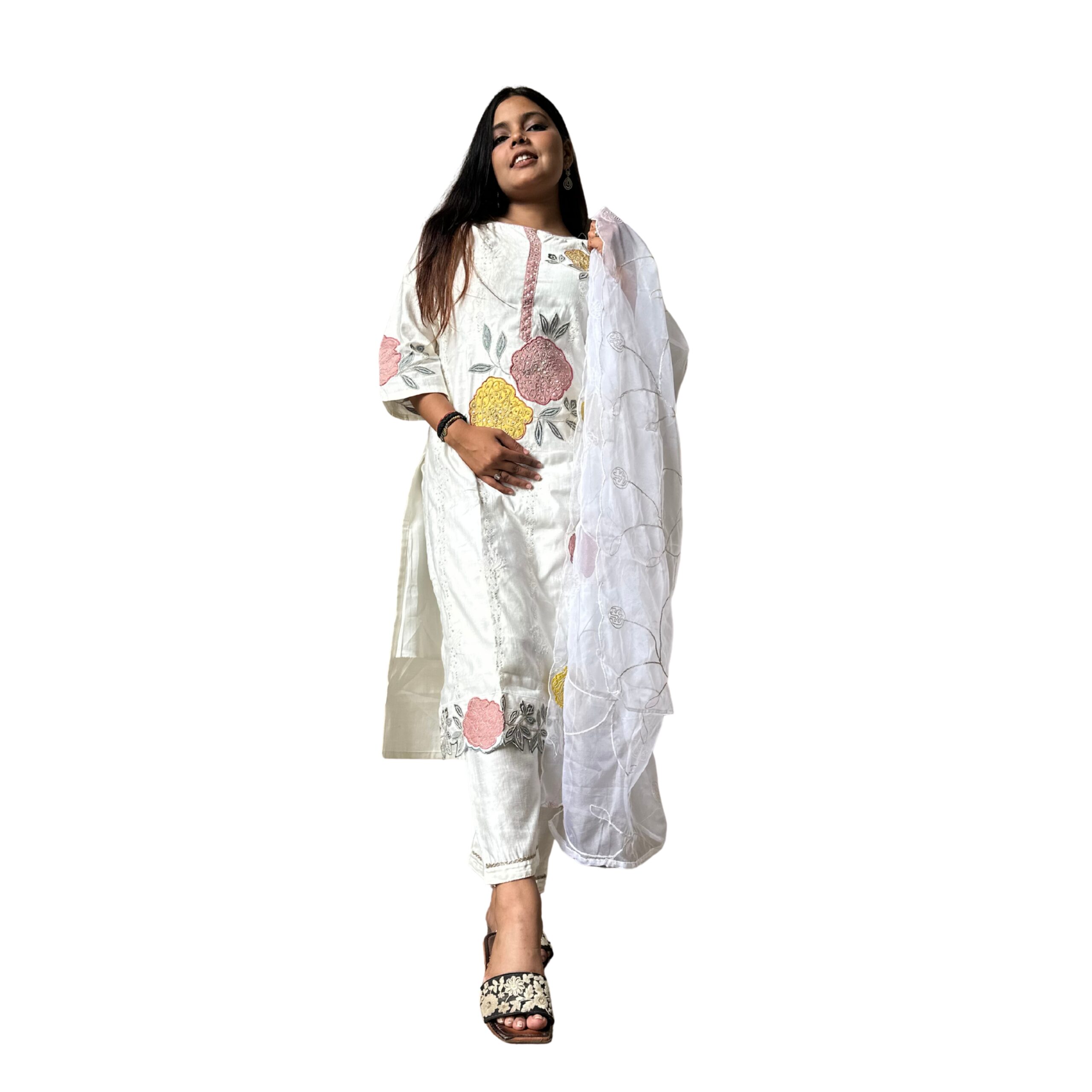 Elegant white cotton suit set featuring multicolored floral embroidery, paired with matching bottoms and a sheer embroidered dupatta. Perfect for casual outings, festive wear, or semi-formal occasions.