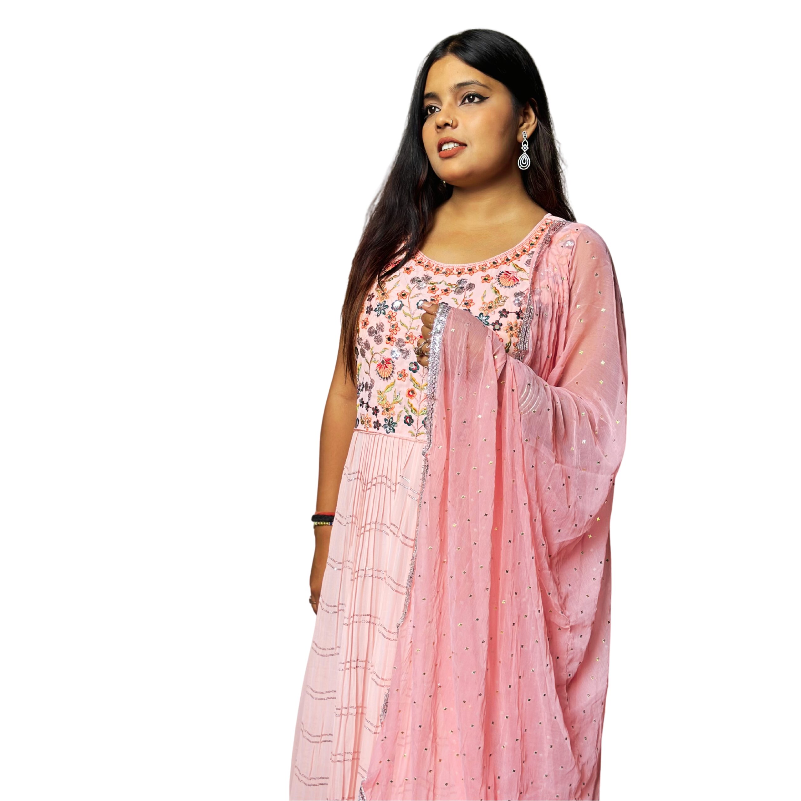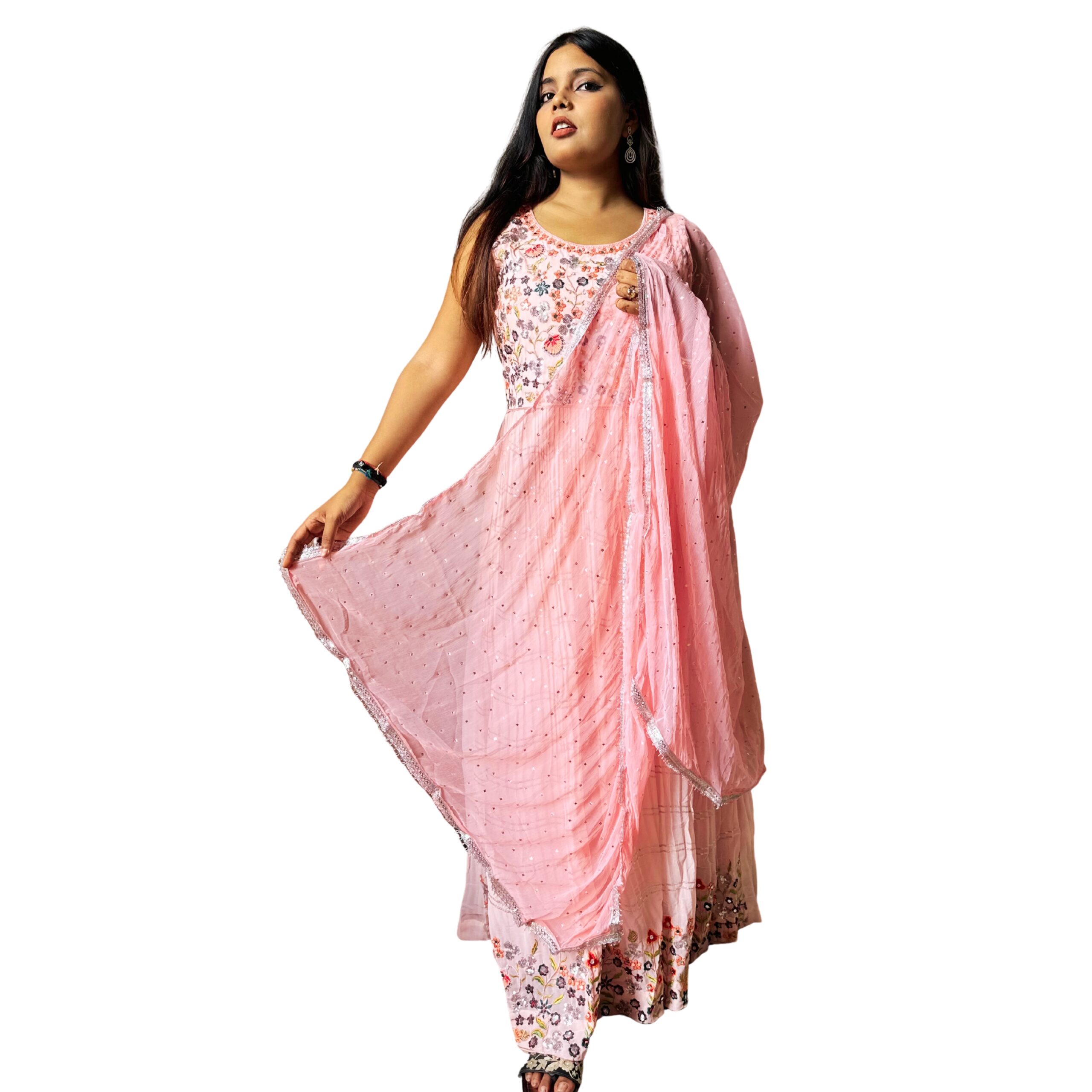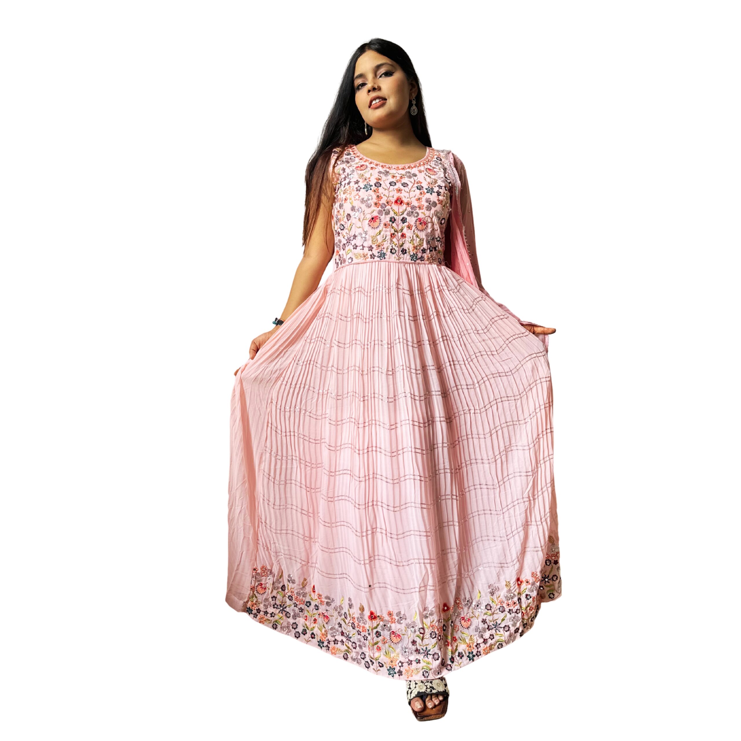 Women’s Pink Embroidered Sleeveless Gown with Dupatta For Festive, Party & Ethnic Wear.
